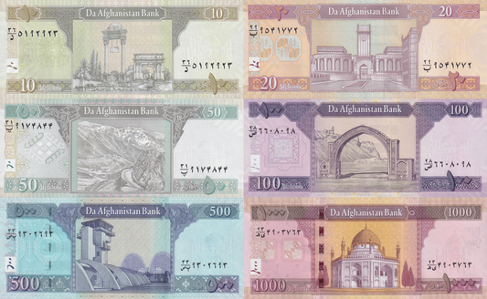 Afghanistan 10 20 50 100-1000 Afghanis 2002-22 P 67 68 69 70 74 76 UNC Set 6 pcs