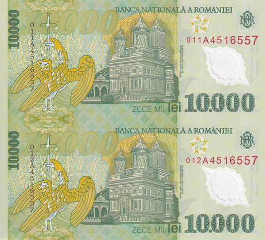 Romania 10000 Lei 2001 P 112b Polymer UNC (UNCUT 2 in 1 ) Banknote Sheet