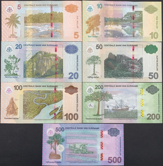 Suriname 5 10 20 50-500 Dollar 2012-2024 P 162b 163-166 166A 166B UNC SET 7 pcs