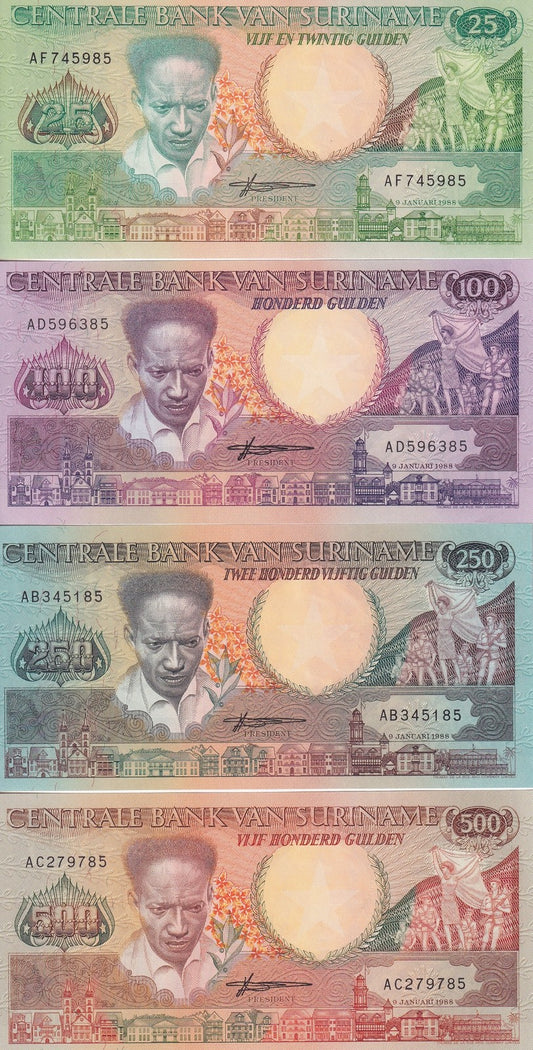 Suriname 25 100 250 500 Gulden 1986-1988 P 132 133 134 135b UNC Set 4 pcs