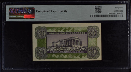 Kingdom of Greece 20 Drachmai 1940 P 315 UNC PMG 65 EPQ 3rd TOP POP