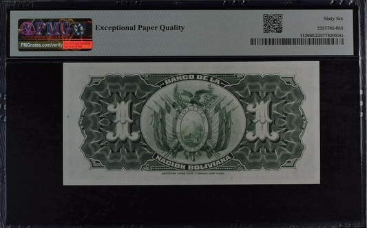 Bolivia 1 Boliviano 1911 (ND 1929) P 112 UNC PMG 66 EPQ 2nd TOP POP