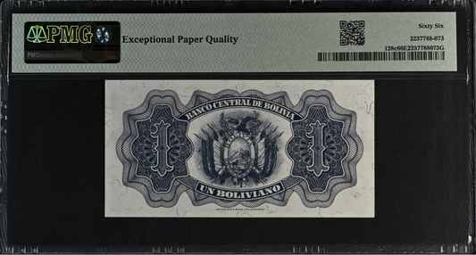 Bolivia Banco Central 1 Boliviano 1952 P 128c UNC PMG 66 EPQ 2nd TOP POP
