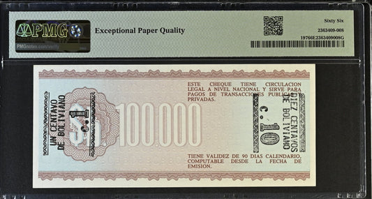 Bolivia 10 Cent on 100000 Pesos Bol 1984 (ND 1987) P 197 UNC PMG 66 EPQ
