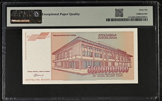 Yugoslavia 500 Billion Dinara 1993 P 137a UNC PMG 66 EPQ AA First Prefix