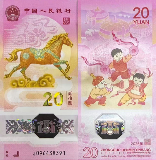 China 20 Yuan 2026 P New Design Polymer Horse UNC COMM. 1/20 Bundle Lot 5 pcs