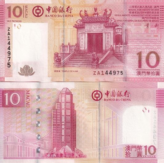 Macau Macao 10 Patacas 2008 P 108a UNC BOC ZA Replacement 1/10 Bundle LOT 10 pcs